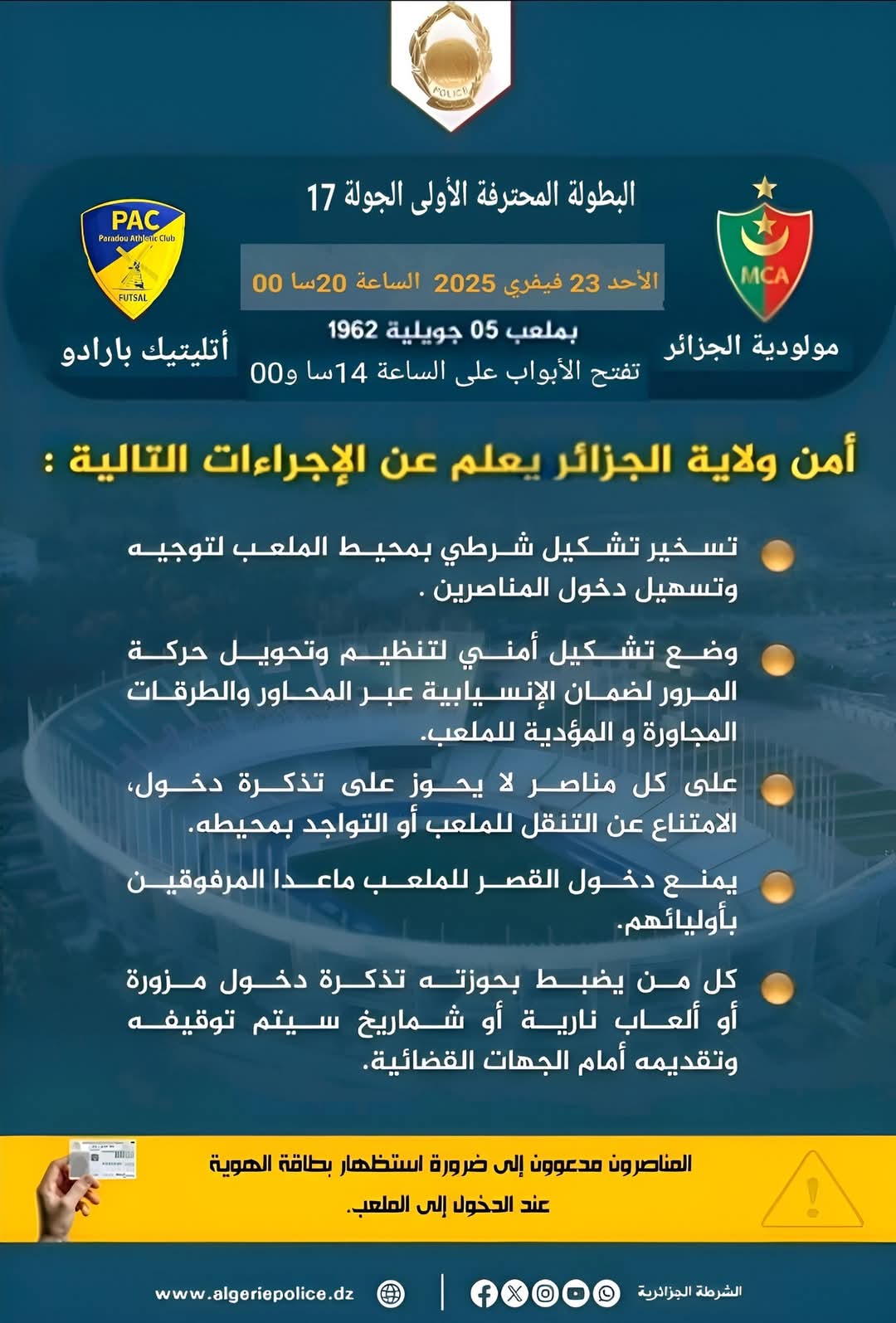 أعلنت مصالح أمن ولاية الجزائر، عبر بيان لها، اليوم السبت، عن إجراءات تخص ضمان السير الحسن لمباراة مولودية الجزائر و نادي بارادو المبرمجة بملعب 5 جويلية غدا الأحد.