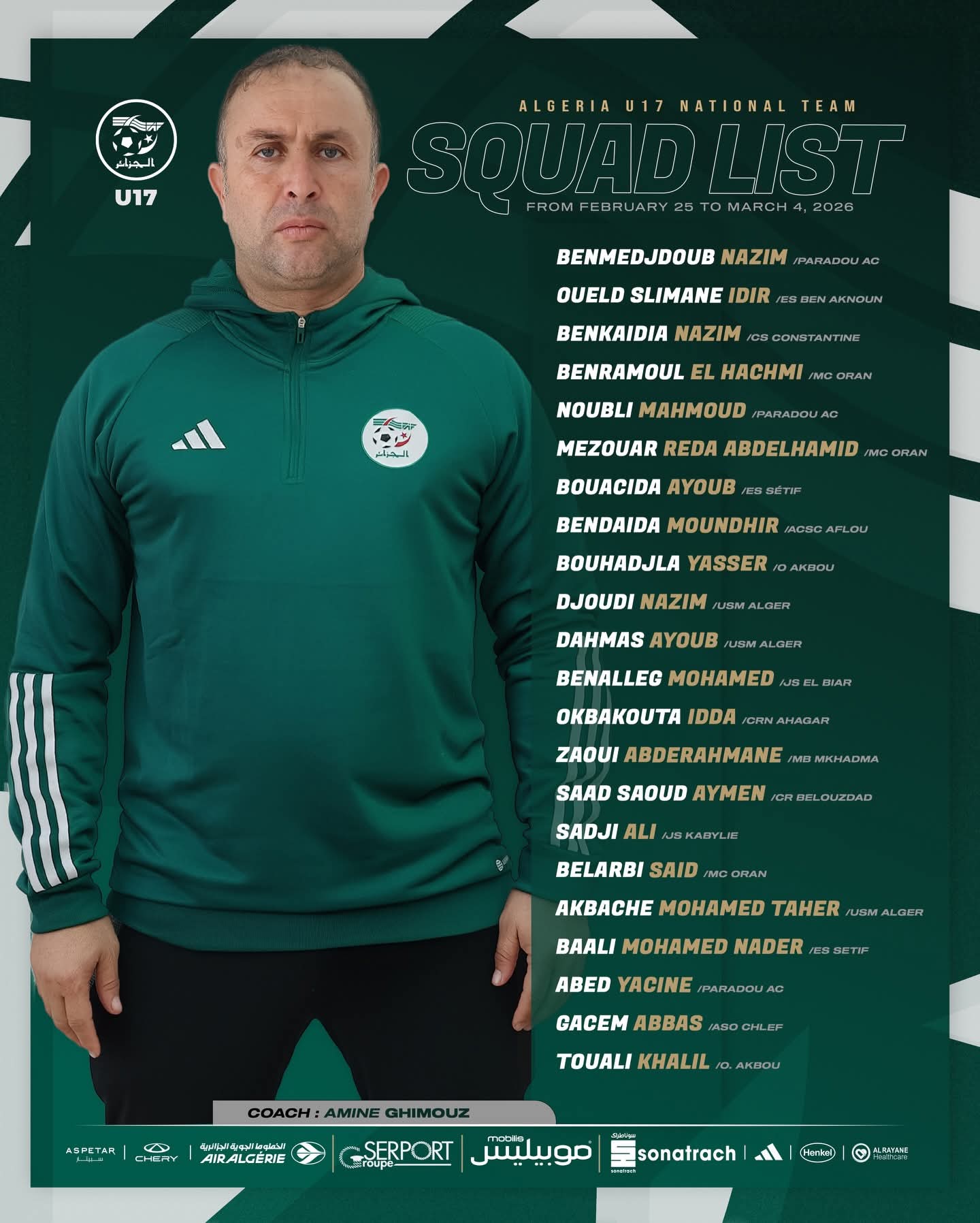 كشف الطاقم الفني للمنتخب الوطني الجزائري لأقل من 17 سنة عن قائمة اللاعبين المعنيين بالتربص التحضيري الذي سيحتضنه مركز فوكة، وذلك خلال الفترة الممتدة من 25 فيفري إلى 4 مارس 2026، في إطار مواصلة برنامج الإعداد والاستعداد للاستحقاقات المقبلة.