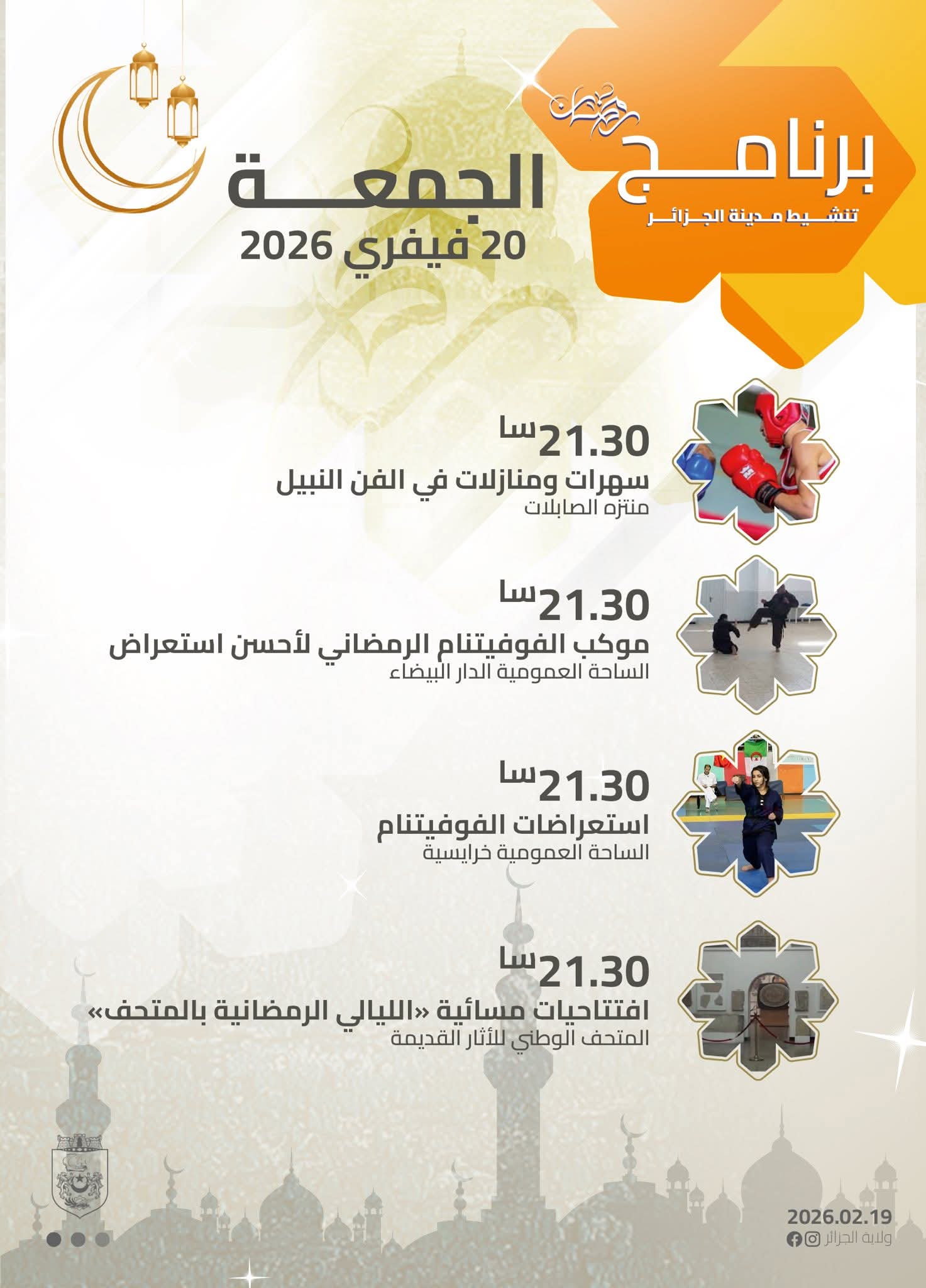تشهد مدينة الجزائر، اليوم الجمعة 20 فيفري 2026، انطلاق برنامج متنوع لتنشيط مختلف الفضاءات العمومية بمناسبة شهر رمضان الفضيل، في إطار جهود إضفاء أجواء احتفالية مميزة على ليالي العاصمة وتعزيز الحركية الثقافية والسياحية.