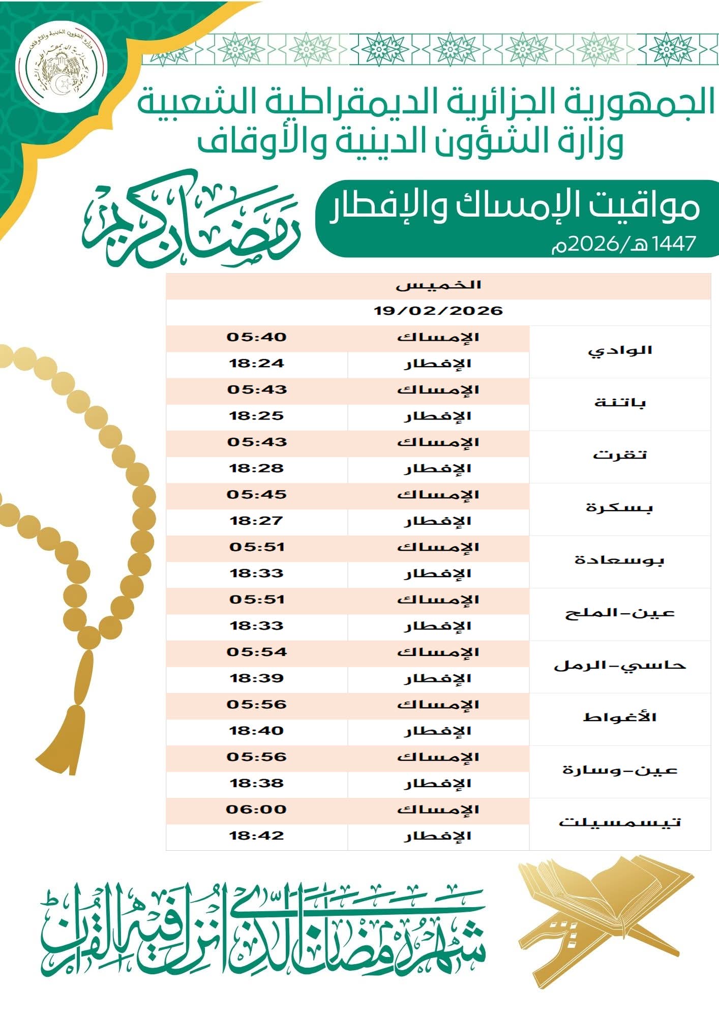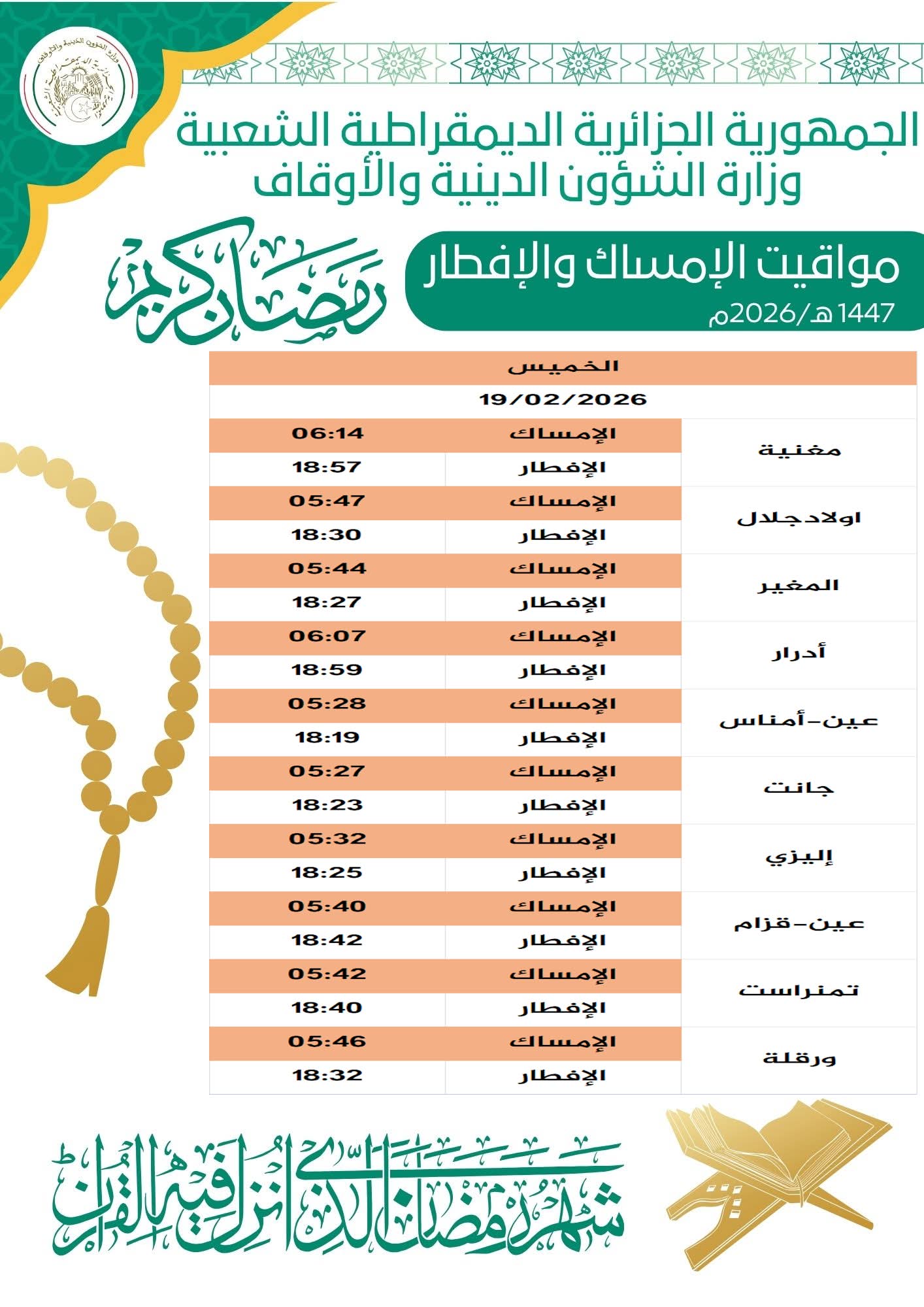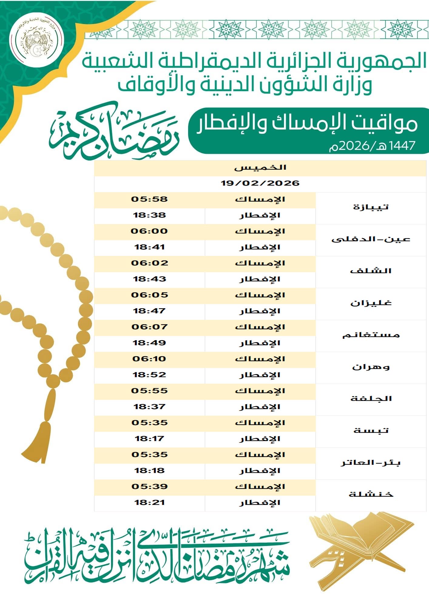 أعلنت وزارة الشؤون الدينية والأوقاف عن مواقيت الإمساك والإفطار عبر مختلف ولايات الوطن، بمناسبة حلول شهر رمضان المبارك لعام 1447هـ، حيث يوافق اليوم الأول من الشهر الفضيل يوم الخميس 19 فيفري 2026.