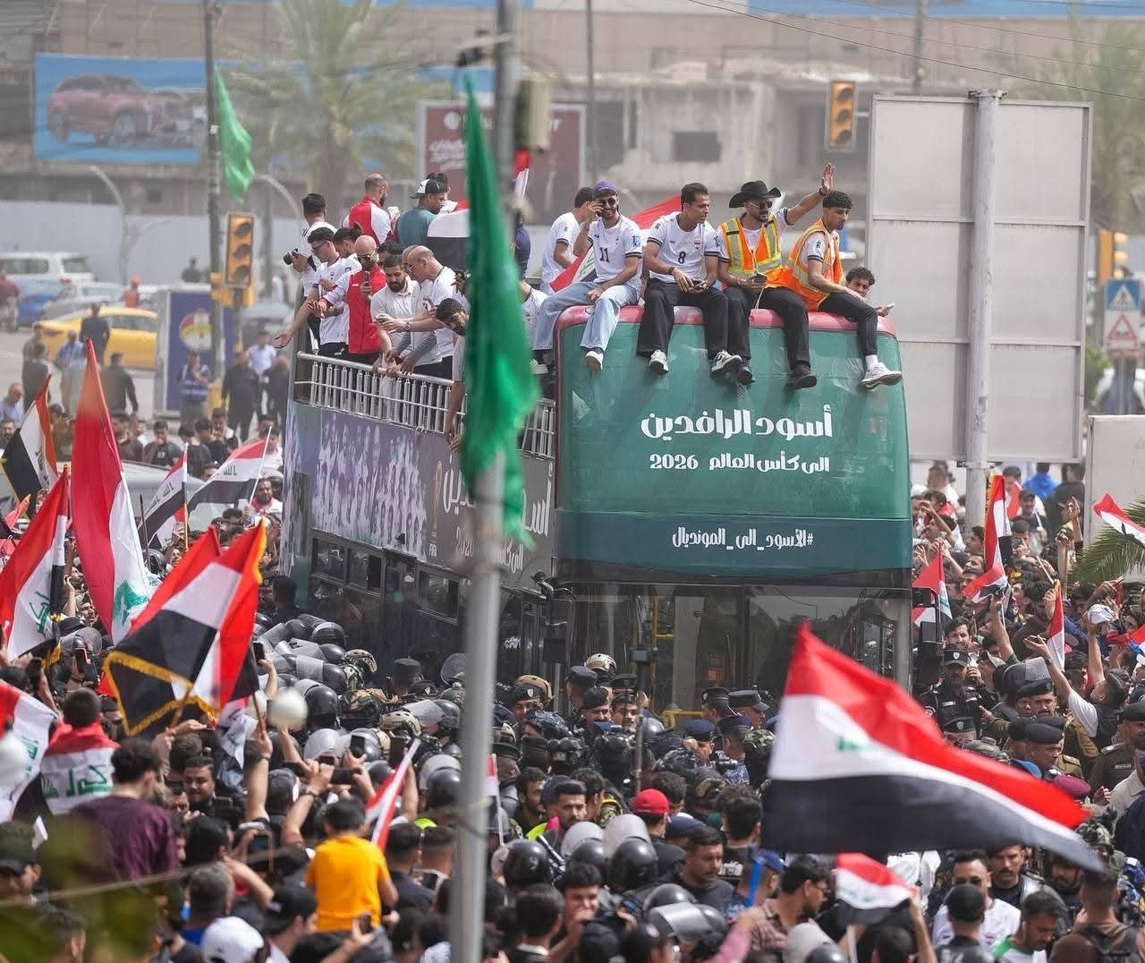 وجابت حافلة مكشوفة تقلّ لاعبي المنتخب، المعروفين بلقب “أسود الرافدين”، شوارع بغداد وسط حضور جماهيري غفير، حيث احتشدت الجماهير على جانبي الطرقات ملوّحة بالأعلام العراقية ومرددة الأهازيج الوطنية احتفاءً بهذا الإنجاز الكروي الكبير.
